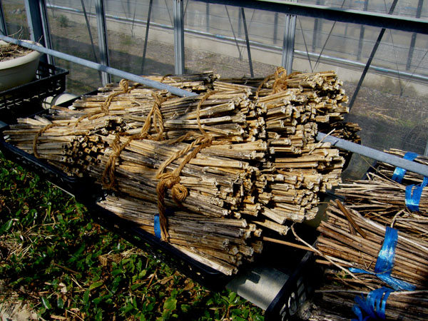 カンタンが卵を産み付けたメハジキソウの茎を11月ころ30cmほどにカットし、温室の脇に作った